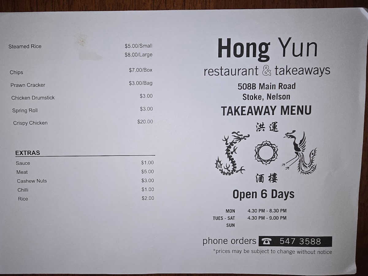 Hong Yun Chinese Restaurant & Takeaways, located at 508 Main Road Stoke in Nelson, offers a diverse and flavorful menu, providing a variety of options for every taste. Starting with the soups, diners can enjoy comforting options like Chicken Sweet Corn Soup, Wonton Soup, and the tangy Hot & Sour Soup.